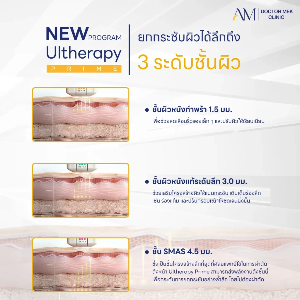 โปรแกรม Ultherapy Prime เป็นเทคโนโลยีในการยกกระชับผิวหน้าระดับลึกที่ใช้คลื่นเสียงความถี่สูงแบบเฉพาะจุด หรือที่เรียกว่า Microfocused Ultrasound with Visualization (MFU-V) จุดเด่นของเทคโนโลยีนี้ คือ สามารถส่งพลังงานลงสู่ชั้นผิวในระดับลึกได้อย่างแม่นยำ โดยไม่ต้องพึ่งการผ่าตัดใด ๆ อีกทั้งยังสามารถมองเห็นชั้นผิวแบบเรียลไทม์ผ่านหน้าจอ ทำให้การรักษามีความแม่นยำสูง โดยพลังงานจะถูกส่งลงลึกได้ถึง 3 ระดับชั้นผิว ได้แก่